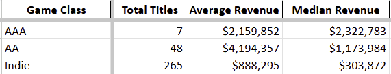 There is no 100% agreed upon definition of what separates AAA, AA, and Indie game studios. Since I used Gamalytic’s filtering to collect this data, we’ll be using their definition for these groups: