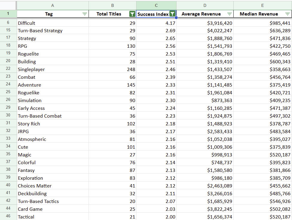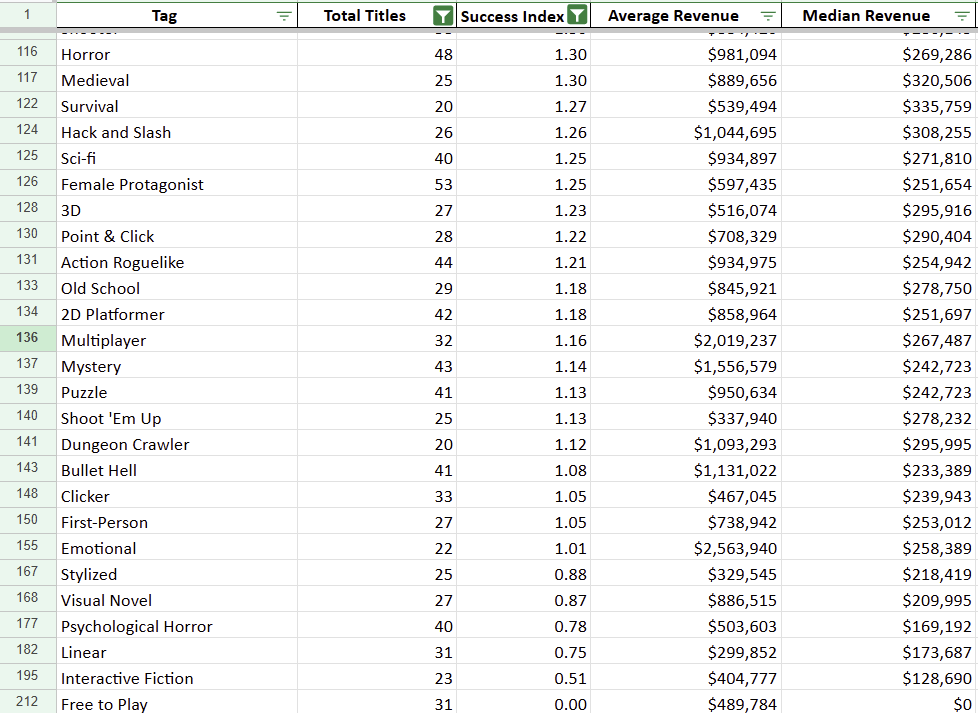 If you simply want to know the top performers head over to the Google Sheet with the full data and filter by your preferred metric. Fair warning simply looking at the top of the list will give you outliers and not very useful data points. You probably won’t learn much from seeing that “Silent Protagonist” has the highest median revenue on the list but was only used in one title that did extremely well.